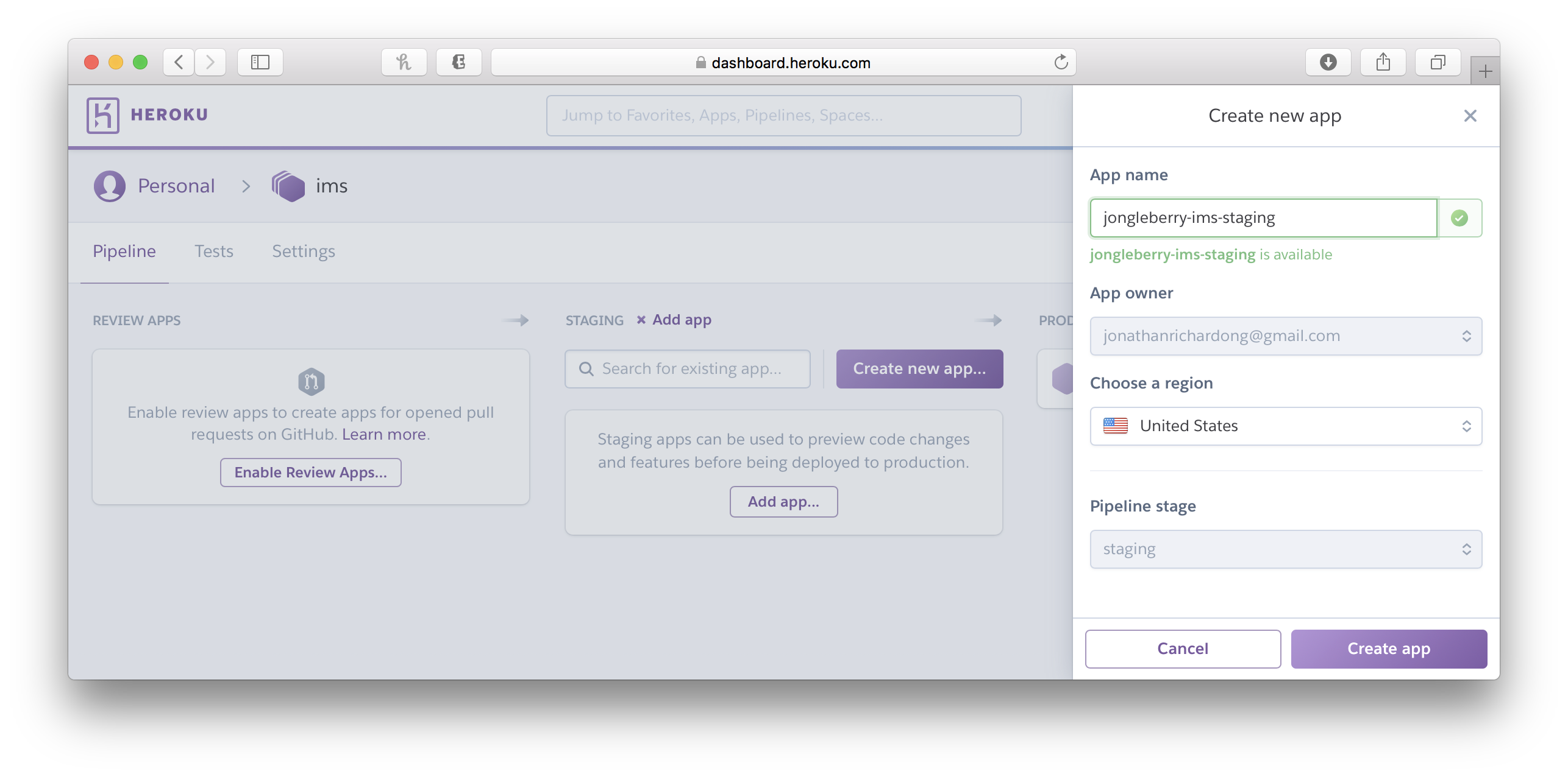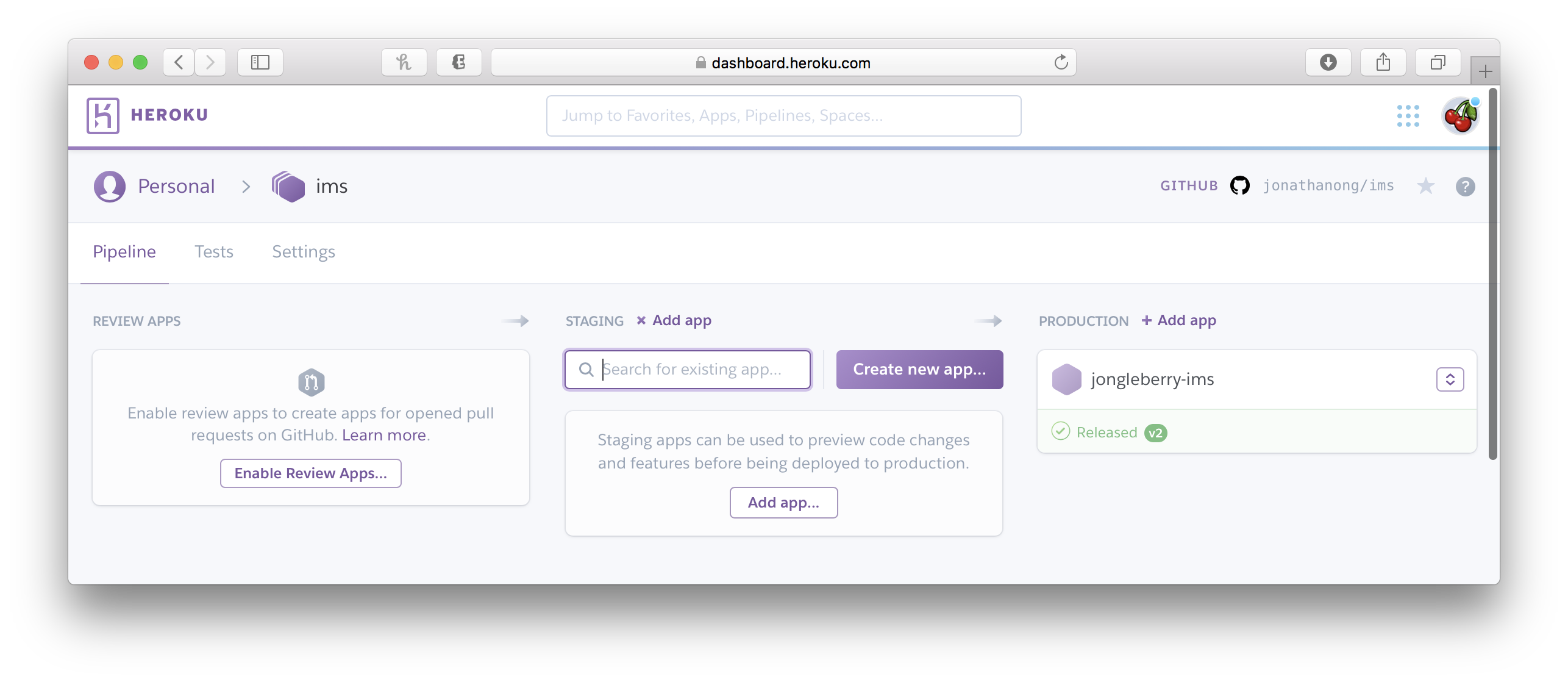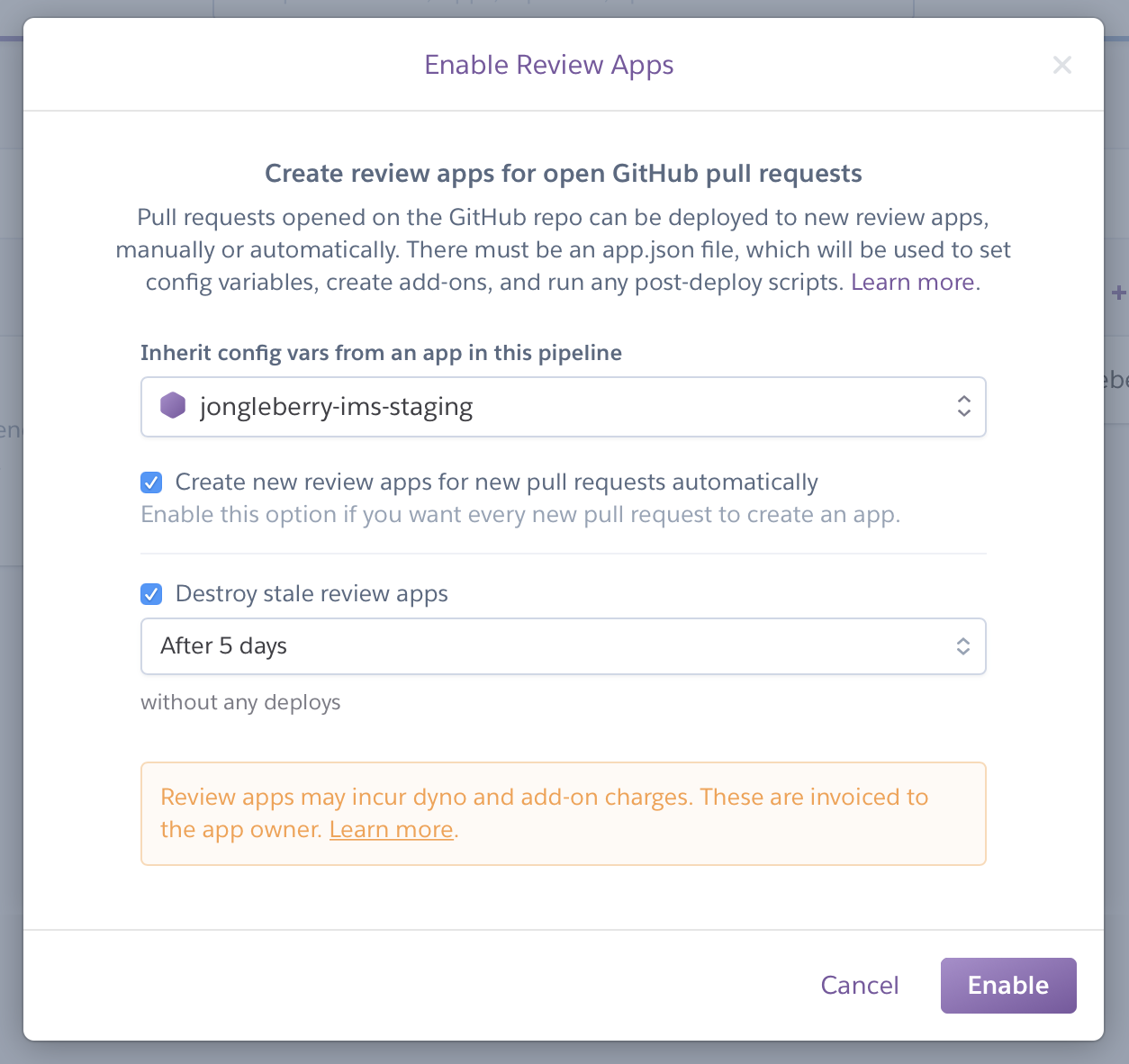 Next, let’s setup our review apps. Review apps are just apps specifically for your PRs. This makes QA and testing easier. You could even run Automation tests against it if you really want! Read more here: https://devcenter.heroku.com/articles/github-integration-review-apps.
