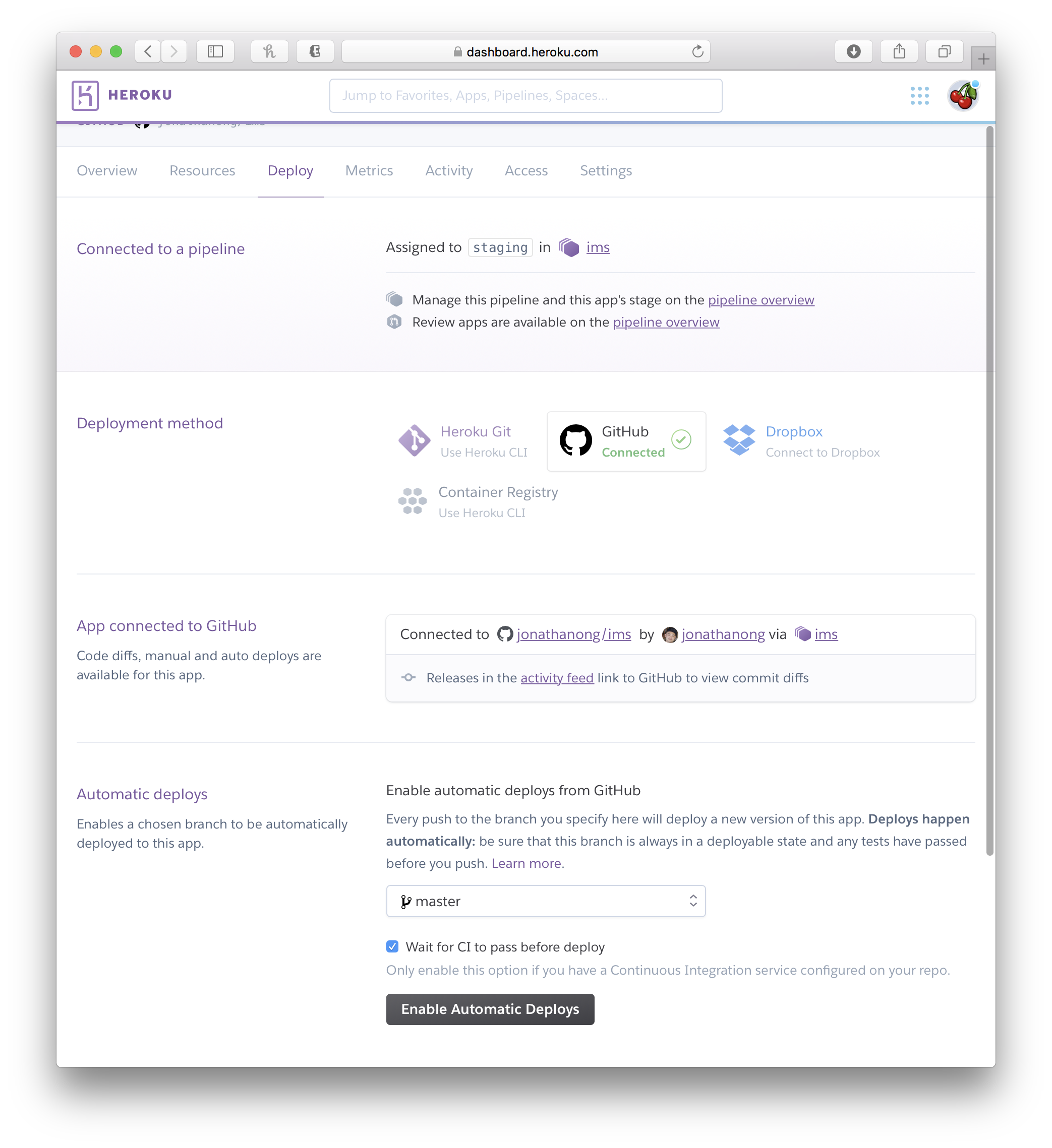 Let’s “Enable Automatic Deploys” from the master branch,